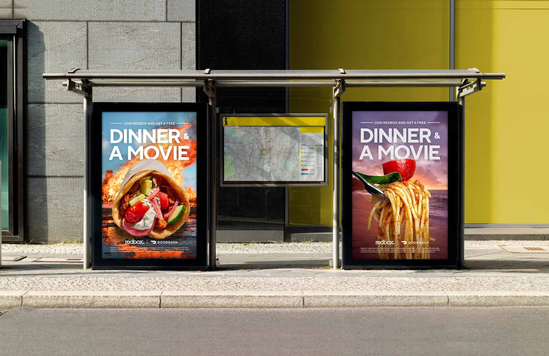 In 2019, DoorDash was fighting to attain market share. So DoorDash and Redbox joined forces to reach new audiences. To celebrate the partnership, we created an irresistible promotion that rewarded new sign-ups on both platforms with a free dinner and movie package. The film and marketing materials promoting the partnership highlighted the large selection on both platforms and the unlimited number of pairings for the perfect movie night.